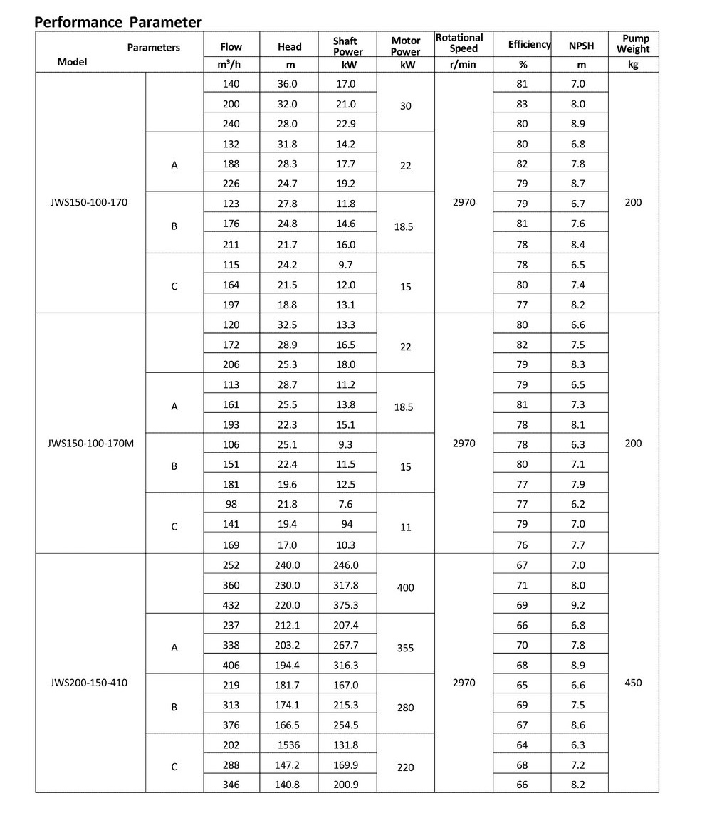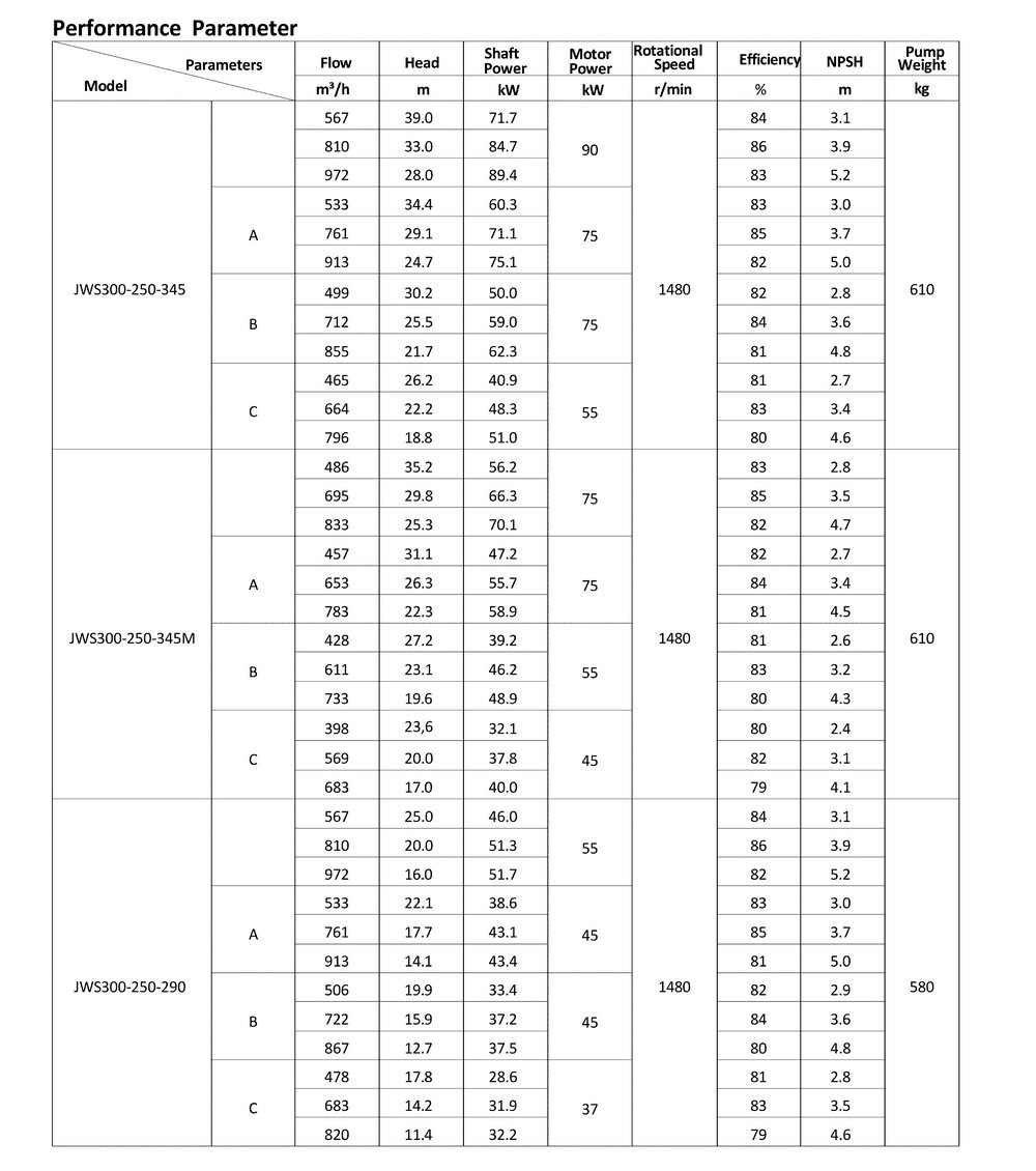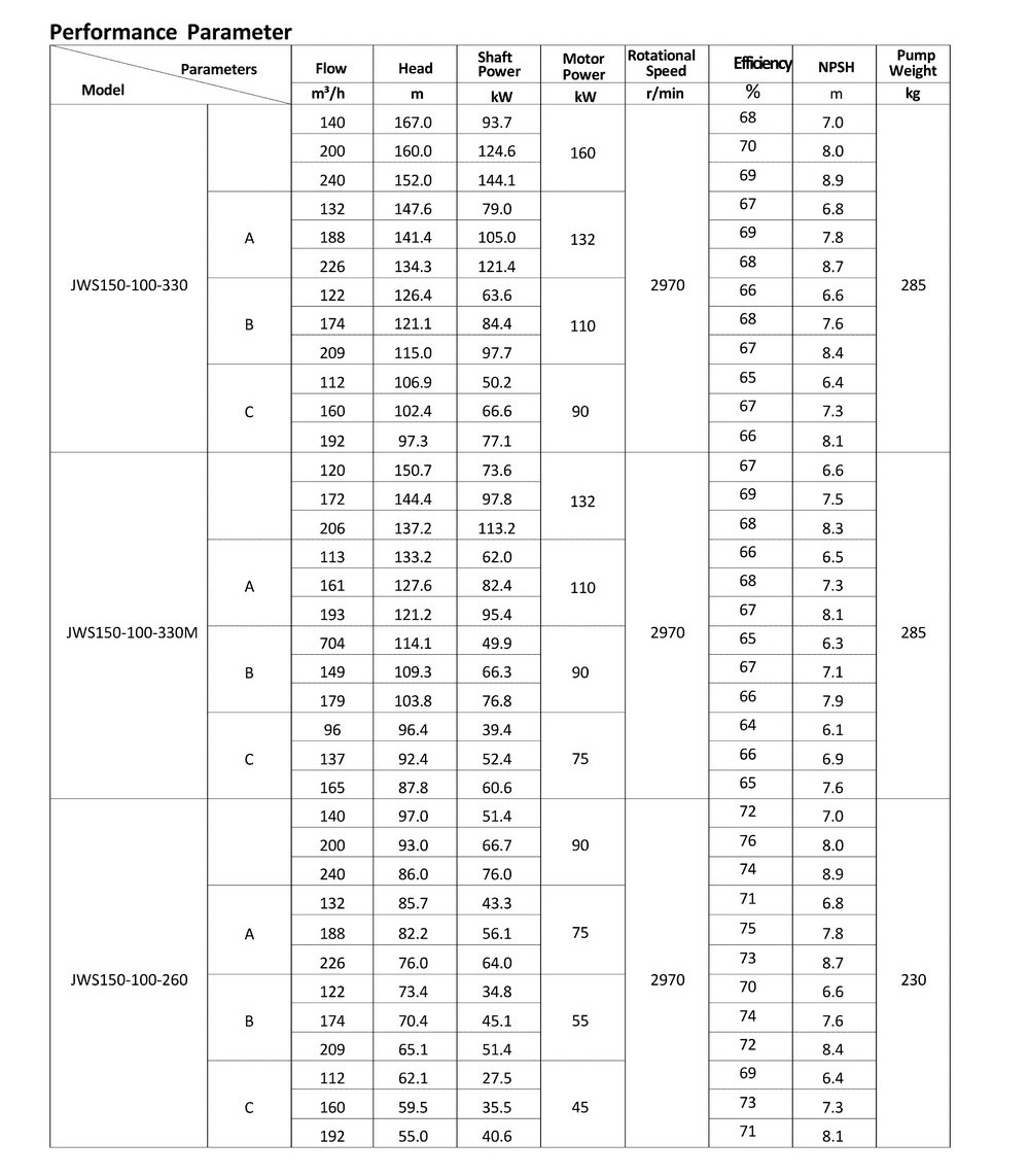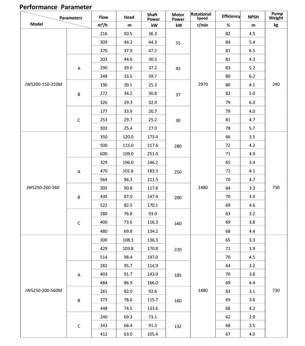 ● The design, manufacturing and quality control of the JWS pumps comply with the GB/T5656 "Centrifugal Pump Technical Requirements, Class II"standard,and its efficiency index meets the GB/T19762 "Clear Water Centrifugal Pump Energy Efficiency Limit and Energy Conservation Evaluation Value" or equivalent ISO standards.