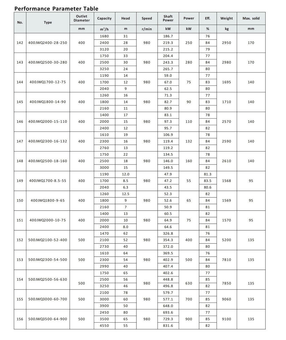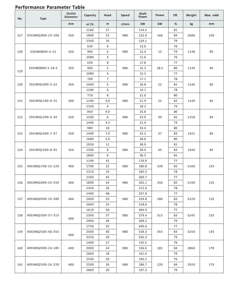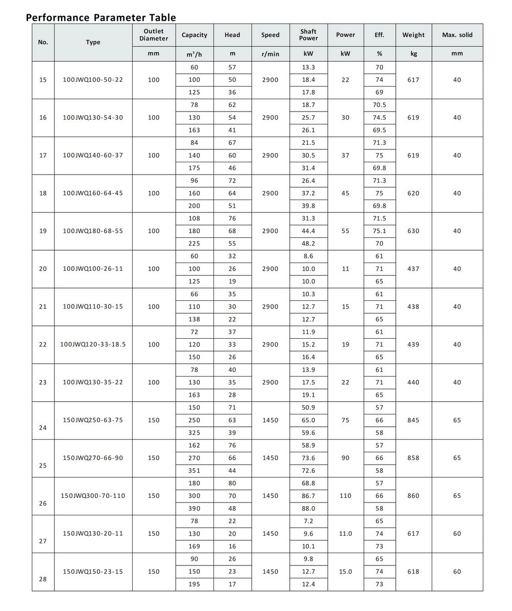 JWQ category products to transport various types of sewage, wastewater, rainwater, or other insoluble solid phase mixed liquids containing solid particles, sediment fiber, and so on.